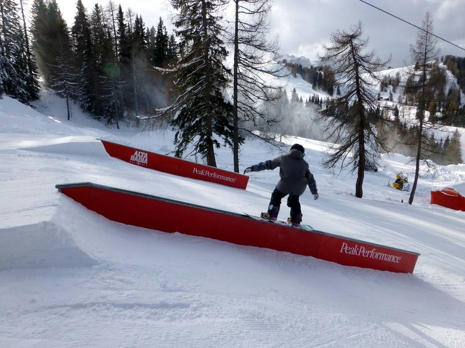Lo Snowpark Alta Badia si trova sull'altopiano del Piz Sorega presso la seggiovia esaposto Ciampai e offre fantastici salti, box e rail.