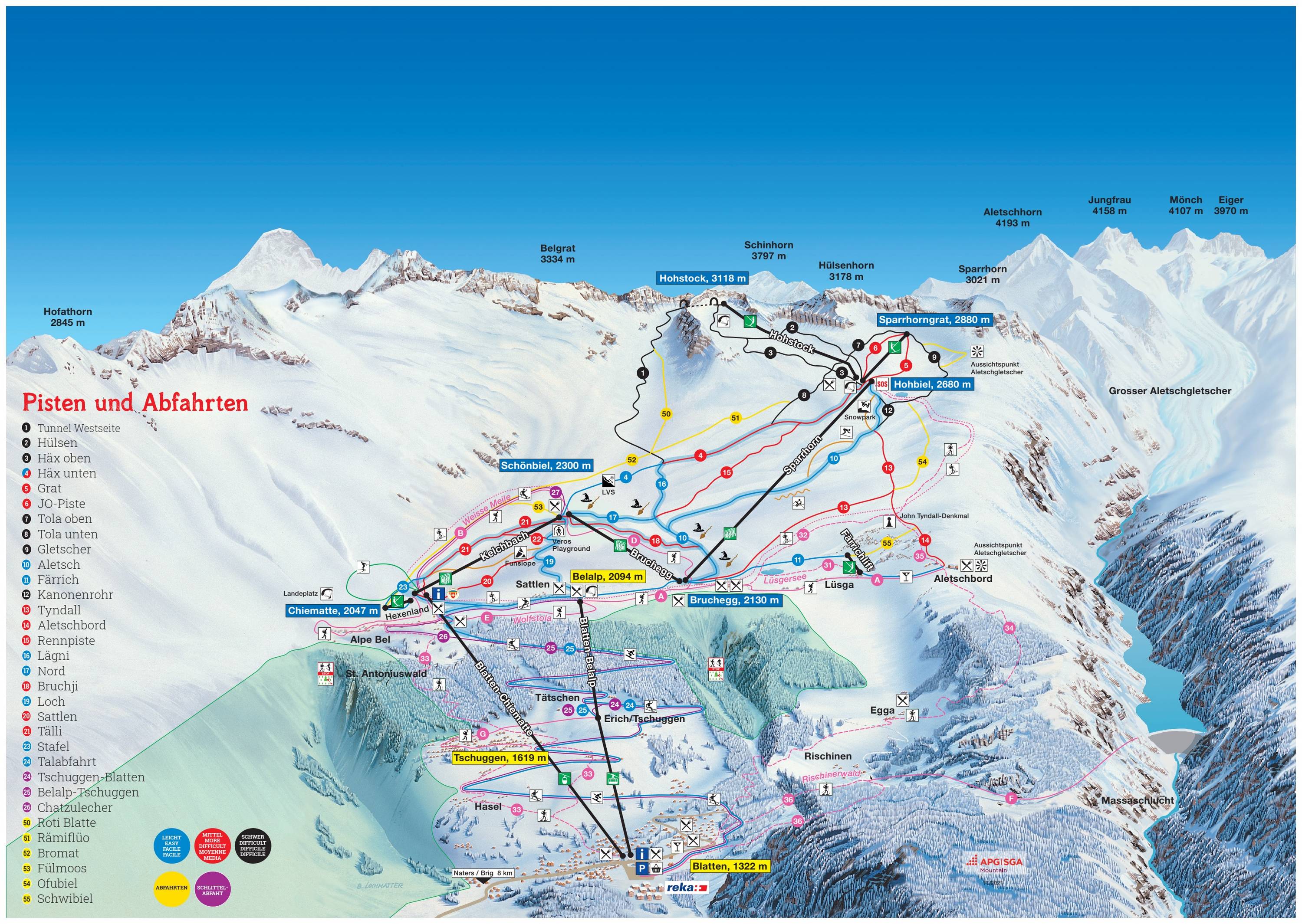 Presso la stazione a valle di Blatten e presso le stazioni a monte della funivia e della cabinovia si trovano pannelli panoramici con informazioni operative aggiornate. Le piste sono tutte molto ben segnalate e contrassegnate. In questo modo ci si orienta facilmente anche in caso di nebbia nel terreno d’alta montagna.