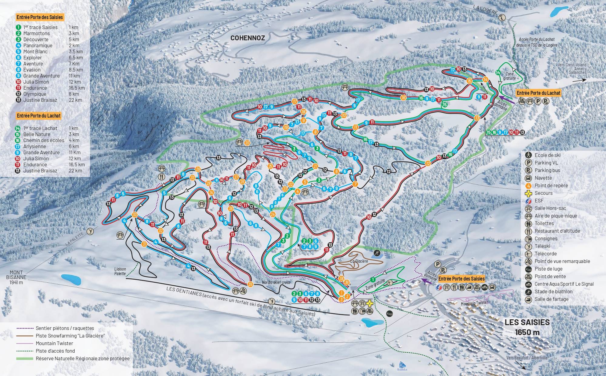 Nonostante le dimensioni dell’area e le diverse esposizioni dei pendii, la mappa delle piste offre un’ottima orientazione e rappresenta il terreno in modo ampiamente accurato. Le piste sono indicate con i loro nomi, il che permette di determinare facilmente la propria posizione attuale in qualsiasi momento.