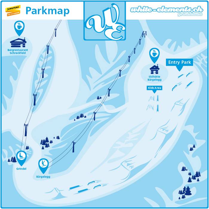Il White Elements Snowpark è stato adattato al terreno e spostato leggermente verso destra visto dal basso. Nella prima (superiore) sezione si trovano due o tre rail o box, seguiti da 3-4 kicker e infine ancora alcuni rail o box. Maggiori informazioni su www.jungfrau.ch/white-elements.Album personale delle vacanze
