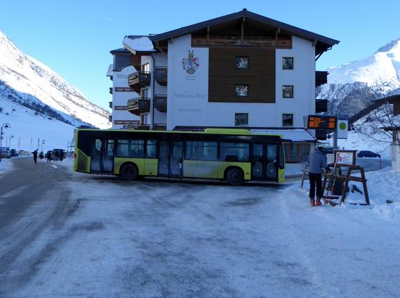 La stazione ferroviaria più vicina è Landeck. Proprio davanti alla stazione parte l’autobus di linea in direzione Paznaun. Il viaggio in autobus fino a Galtür dura poco più di un’ora. - Skibus
