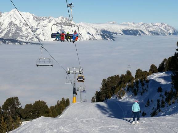 Vista dalla stazione a monte verso il Glungezer,… Seggiovia combinata Tulfein Express Magnifica vista su Innsbruck Stazione a monte della seggiovia combinata…