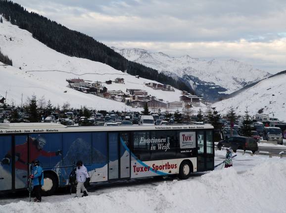 Una fitta rete di skibus collega le località della valle di Tux con il Ghiacciaio di Hintertux. Anche da Mayrhofen nella Zillertal ci sono skibus. In estate, i ghiacciai vengono protetti dai raggi solari con teli di copertura.