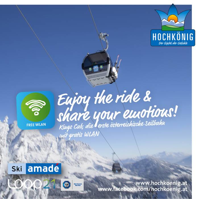 Prima funivia dell'Austria con WLAN sull''HochkönigMühlbach - Hochkönig (17.09.2013) – Come precursore in Austria il comprensorio sciistico di Hochkönig (Mühlbach – Dienten) offre l'impianto funivia Kings Cab dotato di WLAN gratuita e piattaforma informativa „Mountainment®“. Lo specialista del wireless Loop21 gestisce il progetto, fornisce hardware e software e trasforma la WLAN in una moderna piattaforma di informazioni per gli ospiti.