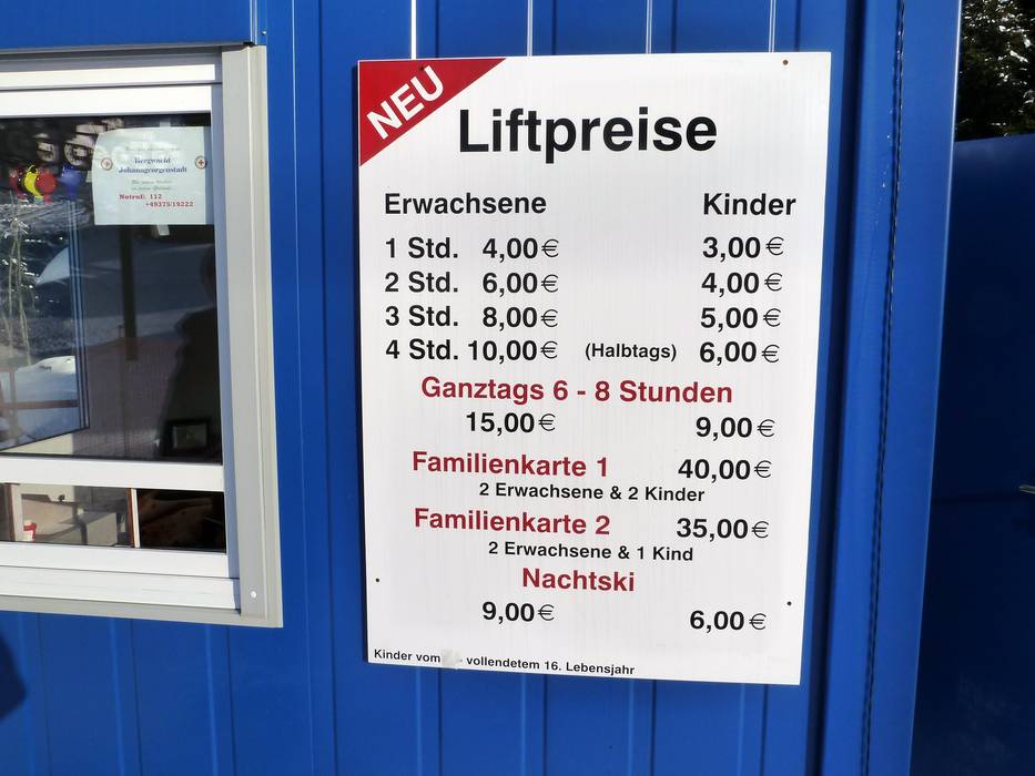 | Nota: Gli orari d'esercizio sono indicazioni generali fornite dal comprensorio sciistico Johanngeorgenstadt - Külliggut e possono variare in funzione di circostanze particolari, giorni settimanali, vacanze scolastiche e festività. | |