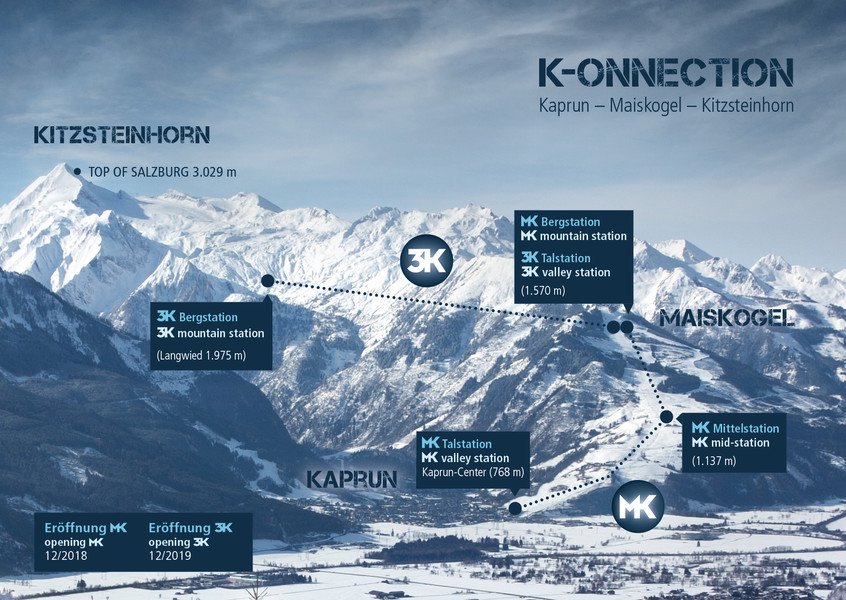 Direttamente dal paese di Kaprun con due nuove funivie sul Maiskogel e da lì fino al Langwiedboden nell’area sciistica glaciale Kitzsteinhorn!Da dicembre 2019 una modernissima cabinovia trifune, la 3K Kaprun-Kitzsteinhorn-K onnection, collegherà il Maiskogel con il Kitzsteinhorn.