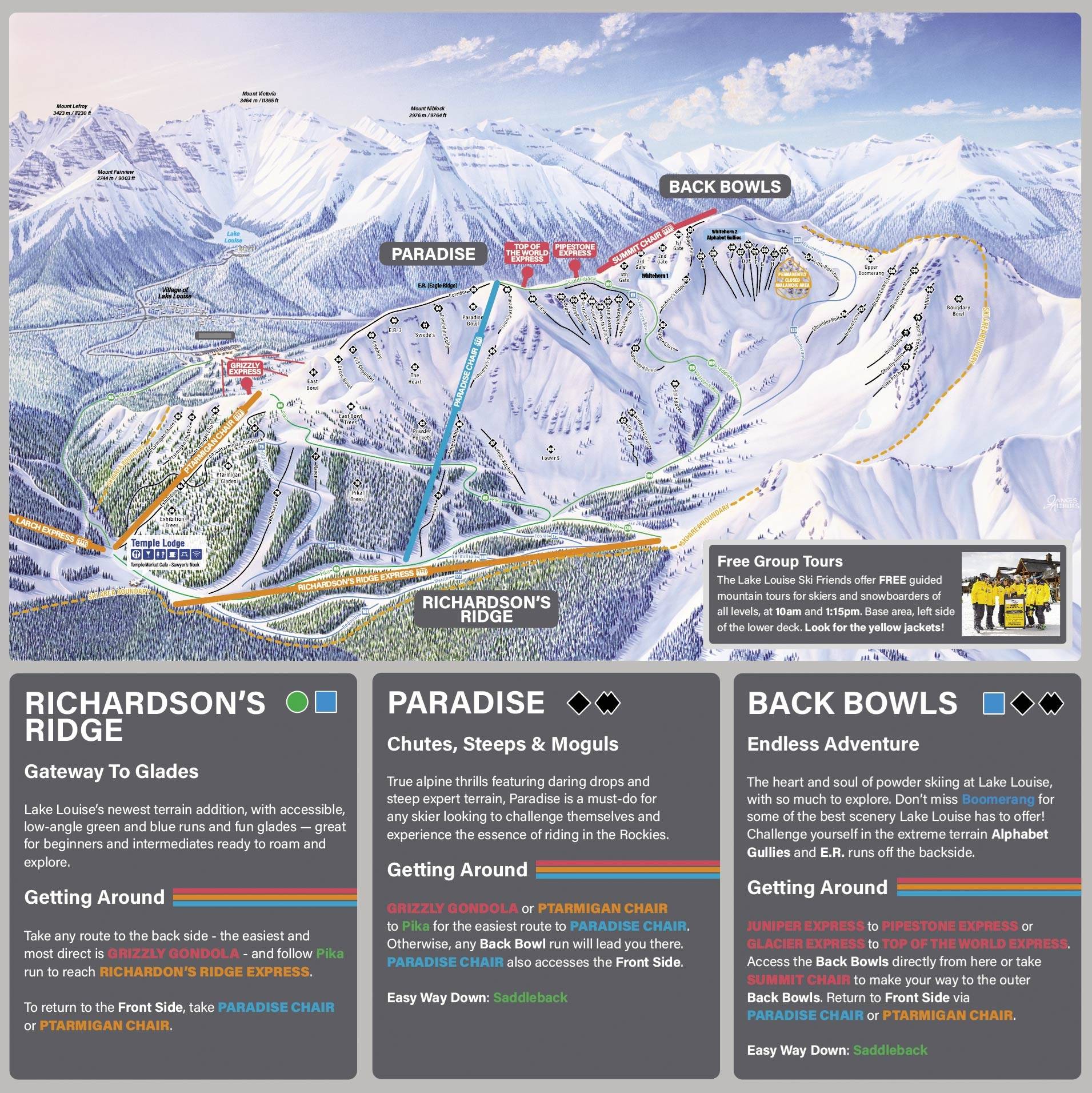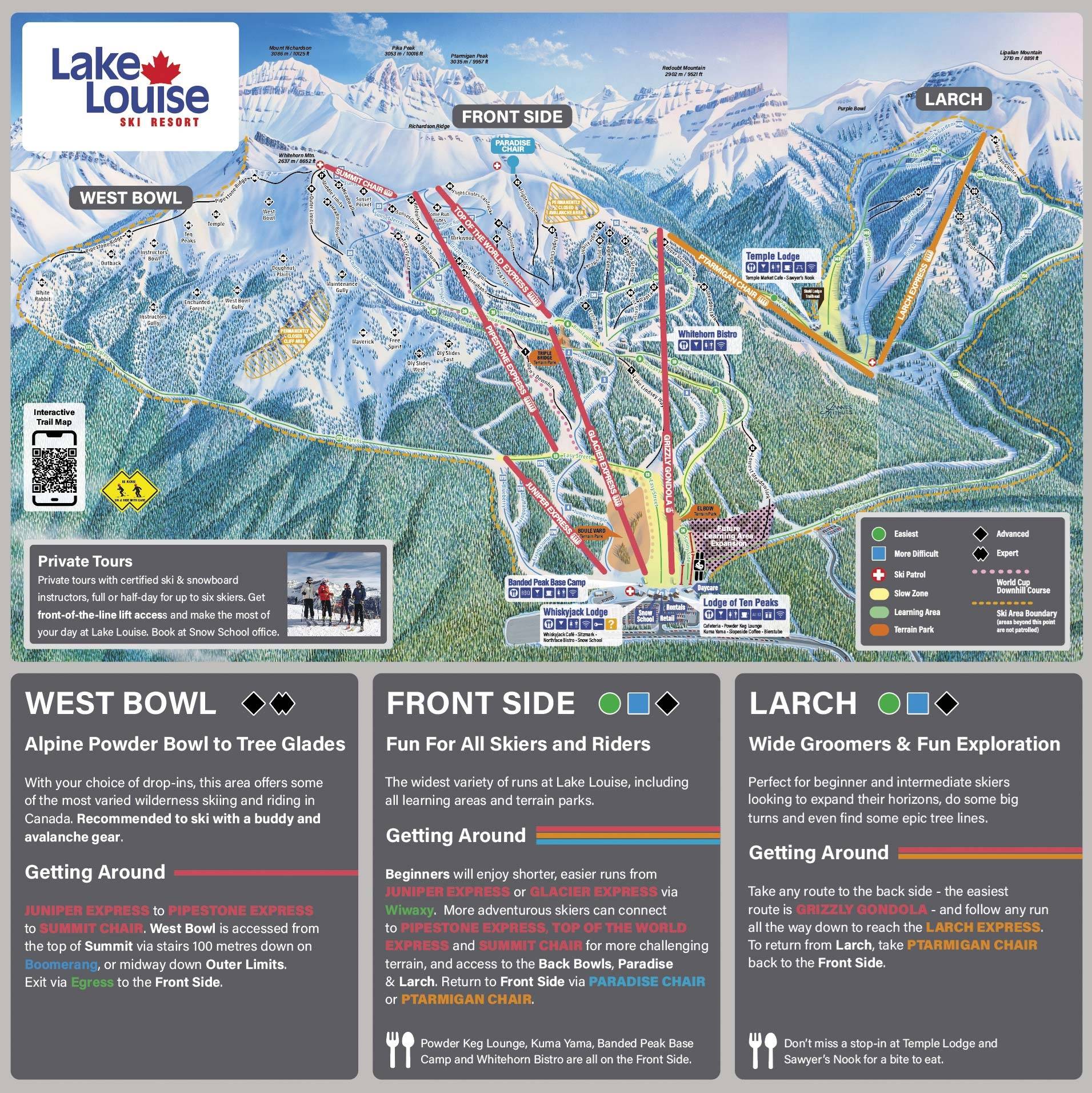 La mappa delle piste di Lake Louise mostra diverse aree del comprensorio sciistico: la panoramica generale, la Front Side, la West Bowl, la Larch e la Back Side con i Back Bowls. Tutte le discese sono indicate sulla mappa con numeri, nomi e livello di difficoltà. Anche gli impianti di risalita sono riportati con dettagli.