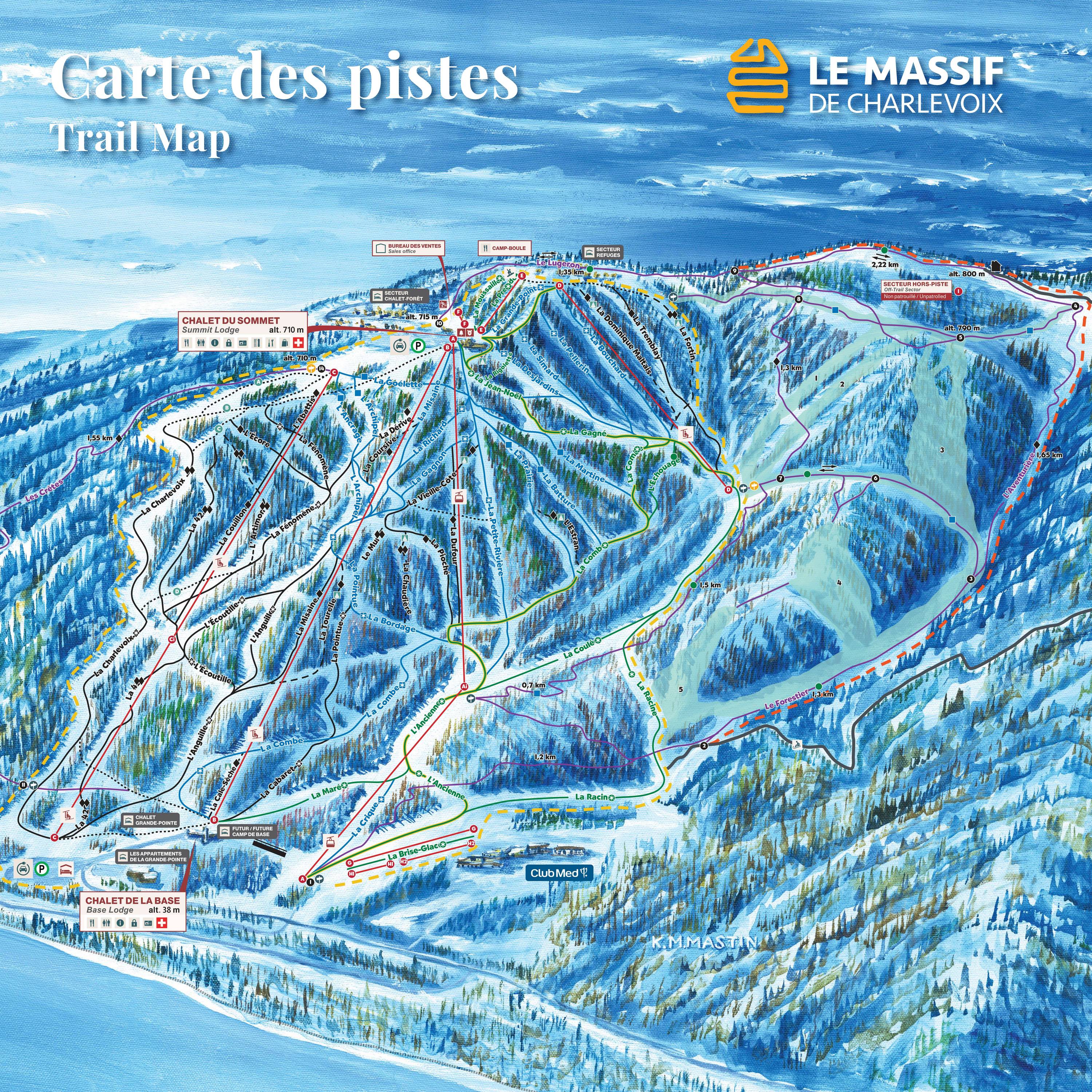 La mappa delle piste rappresenta molto bene l’area sciistica Le Massif de Charlevoix. Sono indicati e ben descritti tutti gli impianti di risalita e le piste. Tutti i punti di ristoro, i parcheggi e lo snowpark sono anch’essi segnalati. Sul retro della mappa delle piste si trovano ulteriori informazioni e i prezzi degli skipass.