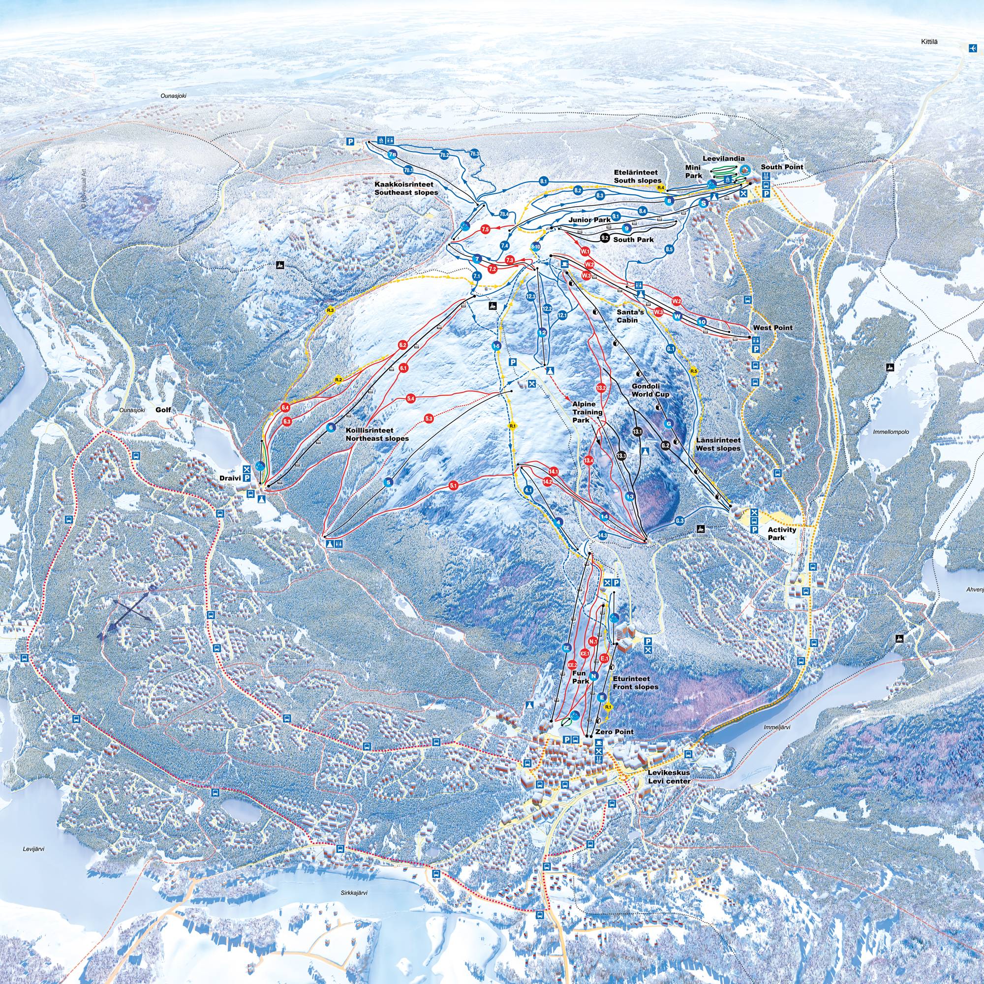 La mappa delle piste rappresenta molto bene l’area sciistica di Levi. Tutte le discese e gli impianti di risalita sono chiaramente contrassegnati con numeri. Sul retro si trovano inoltre gli orari di apertura degli impianti, gli orari degli skibus e altre informazioni utili. La mappa delle piste è anche in un pratico formato tascabile. Le indicazioni sull’altitudine sarebbero ancora auspicabili.