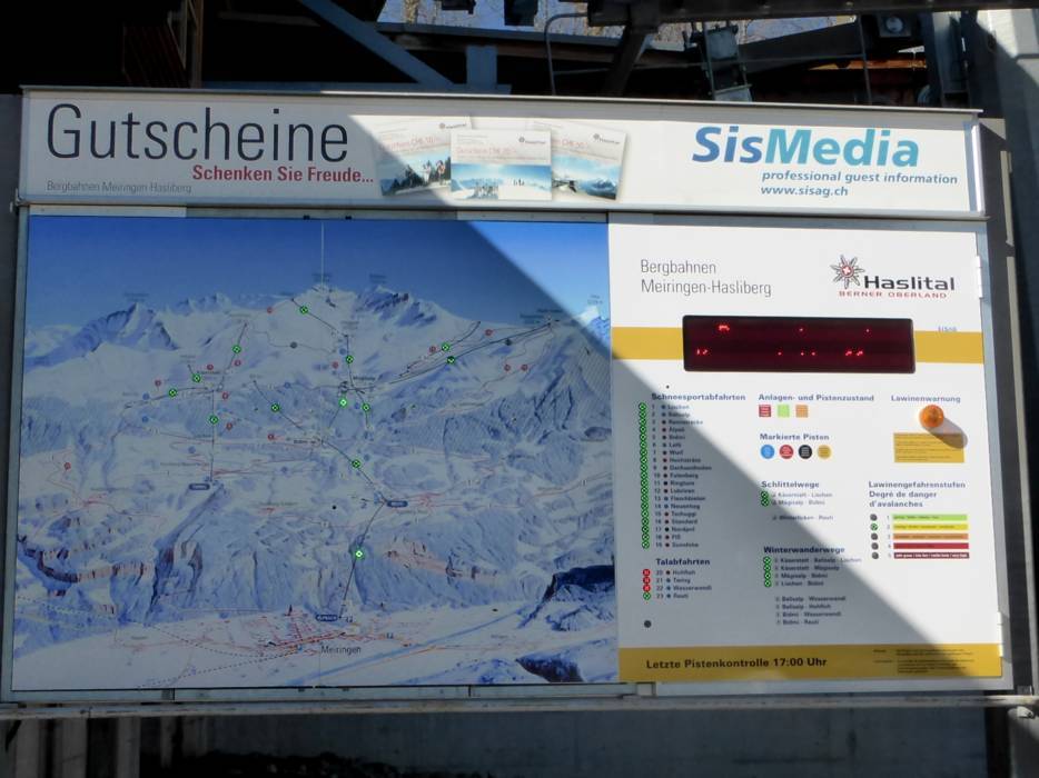 | Nota: Gli orari d'esercizio sono indicazioni generali fornite dal comprensorio sciistico Meiringen-Hasliberg e possono variare in funzione di circostanze particolari, giorni settimanali, vacanze scolastiche e festività. | |
