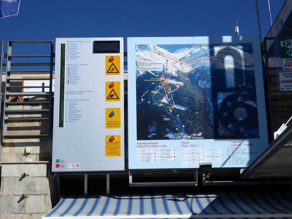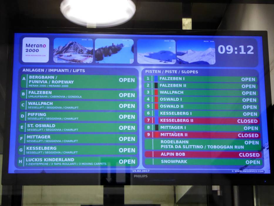 | Nota: Gli orari d'esercizio sono indicazioni generali fornite dal comprensorio sciistico Merano 2000 e possono variare in funzione di circostanze particolari, giorni settimanali, vacanze scolastiche e festività. |