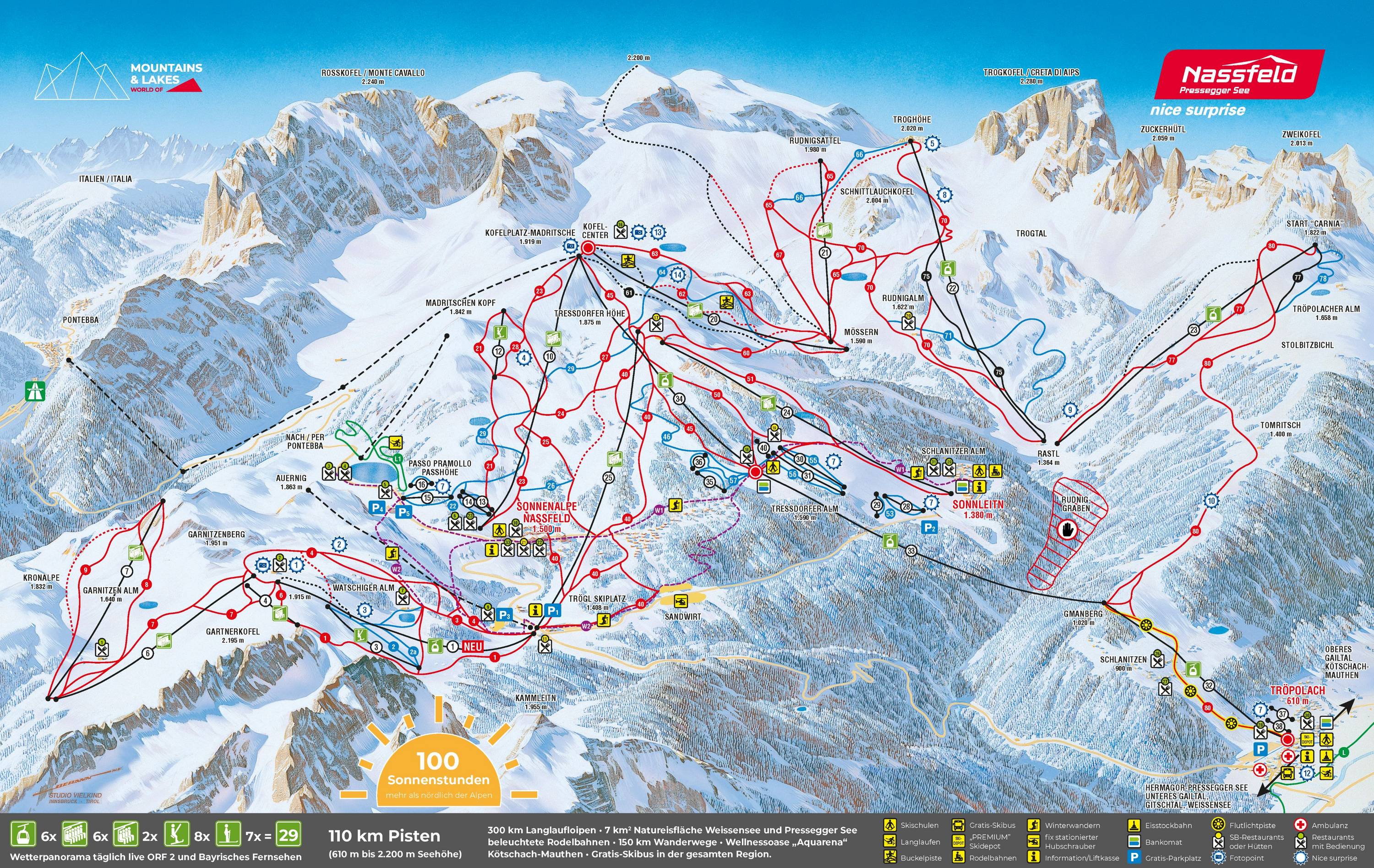La mappa delle piste di Nassfeld è esemplare. Tutti gli impianti di risalita sono indicati con nome, lunghezza e dislivello. Anche tutte le piste sono riportate con numero, nome e lunghezza. Tutti i punti di ristoro sono illustrati con foto e una descrizione dettagliata. Ulteriori informazioni come numeri di telefono importanti, dati altimetrici e molto altro si trovano anch’essi sulla mappa delle piste. I punti salienti sulle piste sono posizionati in modo esemplare e quindi facili da trovare.