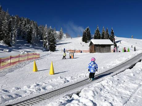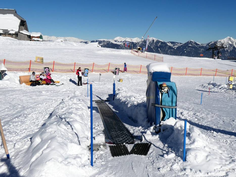 Il Kinderland della scuola di sci DieSkischule.at si trova al passo Passo Pramollo presso la Sonnenalpe Nassfeld. Sul tappeto magico e con simpatiche figure, imparare diventa facile.