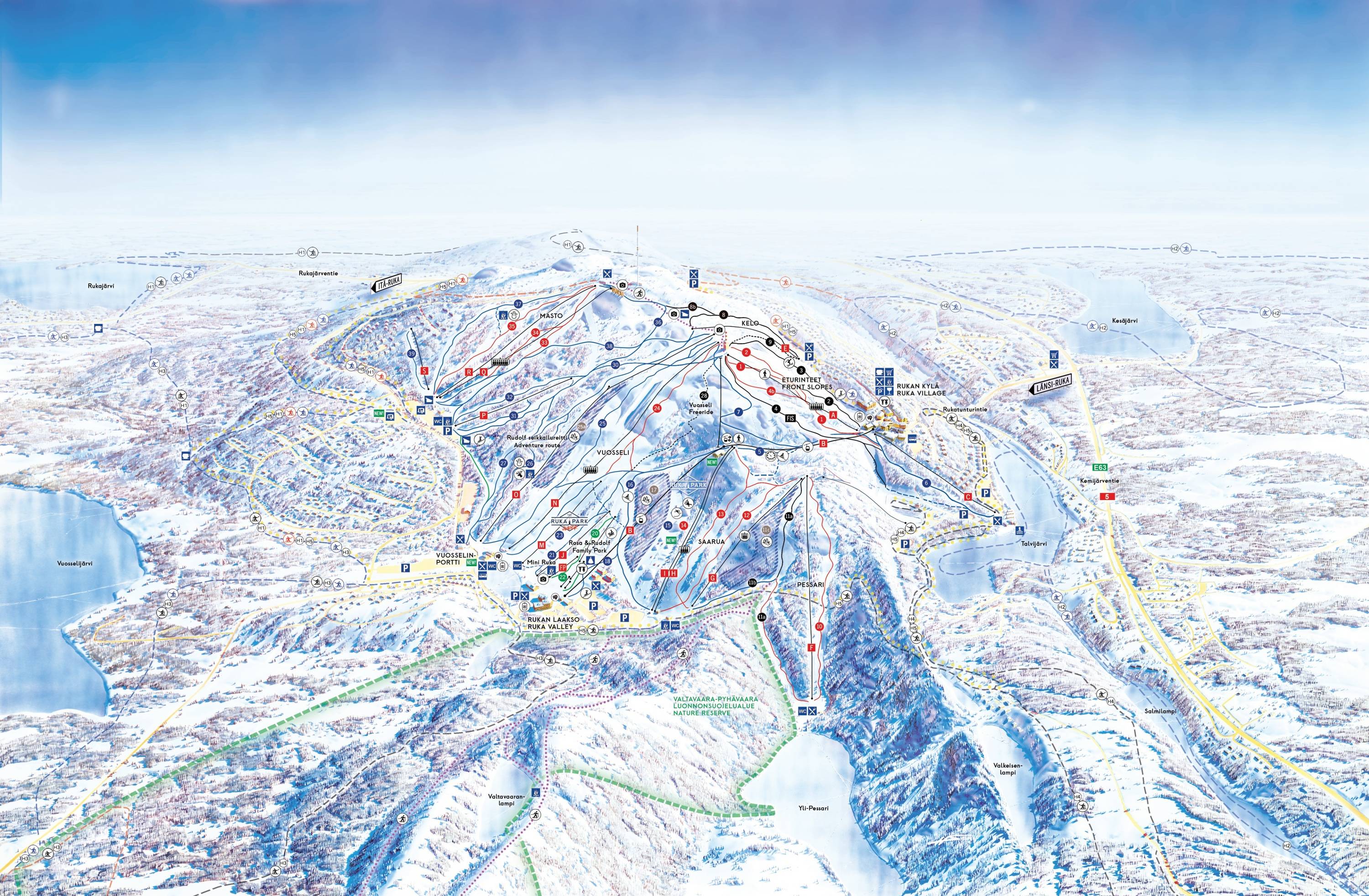 La mappa delle piste rappresenta bene l’intera area sciistica di Ruka. Gli impianti di risalita sono indicati con tutte le informazioni. Sulle discese si trovano i numeri delle piste, ma non i nomi. Sarebbero auspicabili anche le indicazioni delle altitudini. I punti di ristoro sono segnalati con simboli. Inoltre, si trovano informazioni sulle piste per bambini e una mappa del Ruka Village.