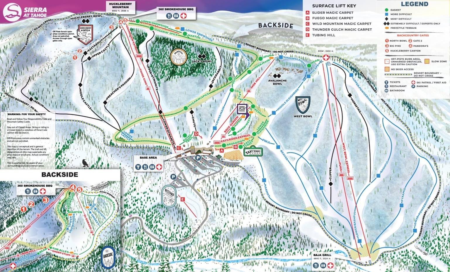 La mappa delle piste rappresenta molto bene l’area sciistica Sierra at Tahoe. Sono segnati e ben descritti tutti gli impianti di risalita e le piste. Tutti i punti di ristoro, i parcheggi e gli snowpark sono anch’essi indicati.