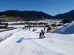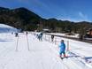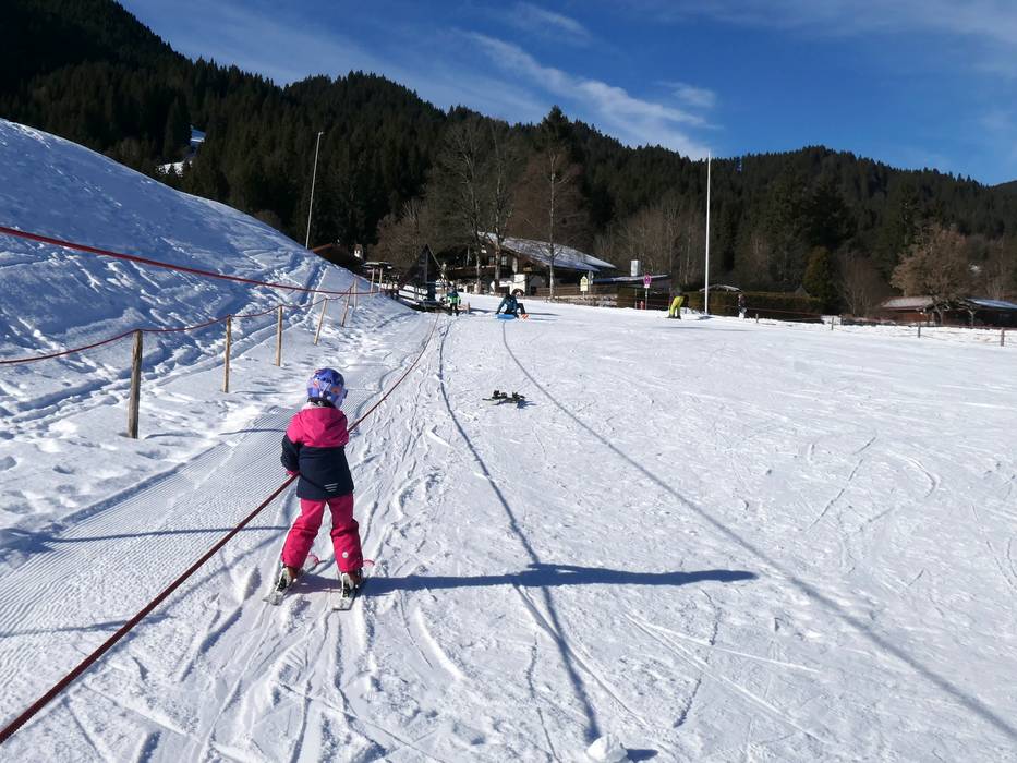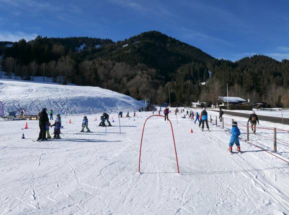 Direttamente alla stazione a valle si estende l’ampia e collegata area principianti. L’accesso è facilitato da due skilift a fune, ai quali ci si tiene con la mano per essere trainati lungo la leggera salita. Successivamente, i bambini possono sviluppare gradualmente le proprie capacità su tre skilift a piattello con difficoltà crescente.