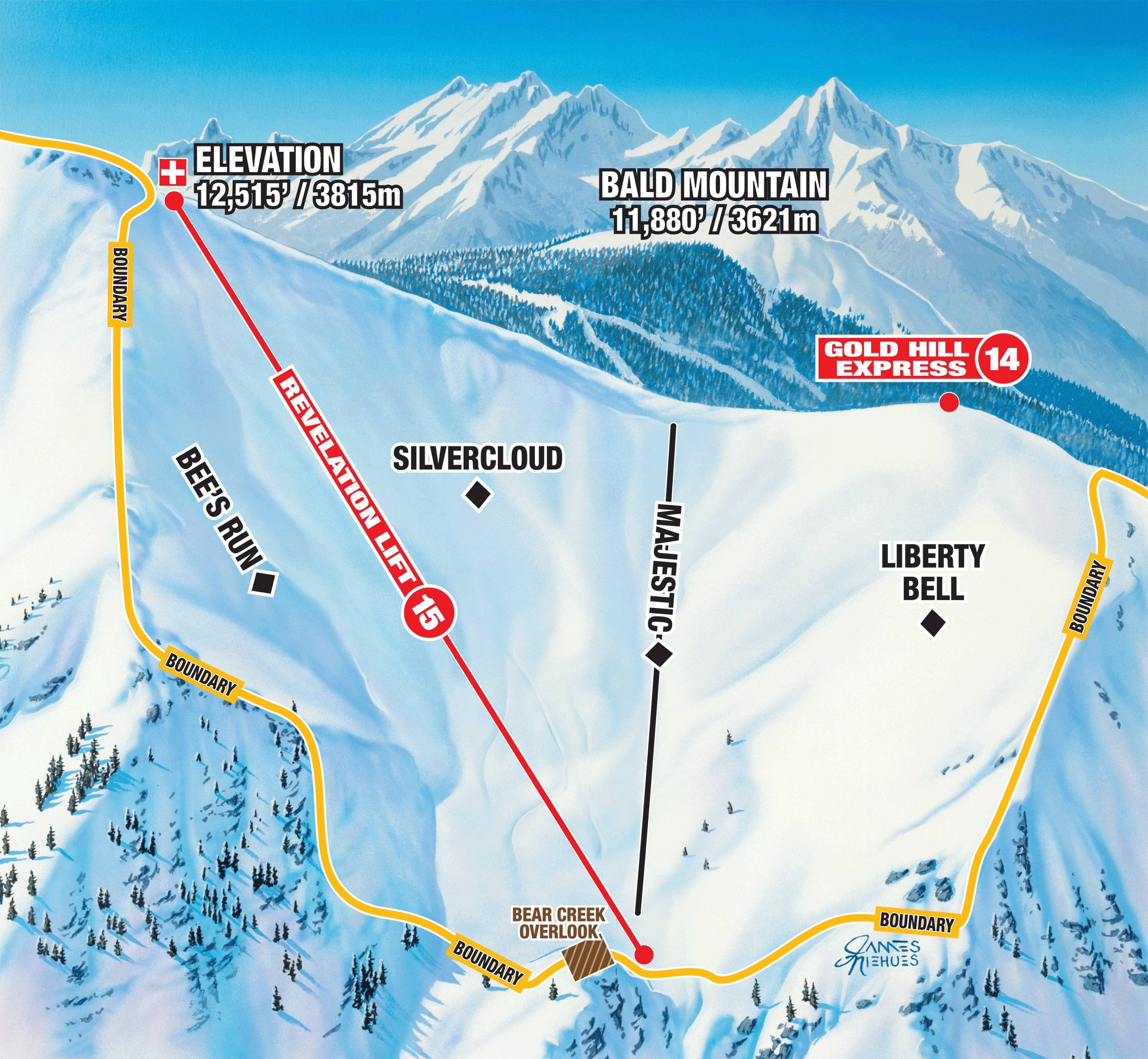 La mappa delle piste rappresenta molto bene l’intera area sciistica di Telluride. Sono indicati tutti gli impianti di risalita, le discese e i ristoranti. Sul retro si trova una mappa dettagliata del Palmyra Peak & Black Iron Bowl e della Revelation Bowl. Numeri di telefono importanti, consigli sui ristoranti e informazioni sull’arrivo sono anch’essi riportati sulla mappa delle piste.