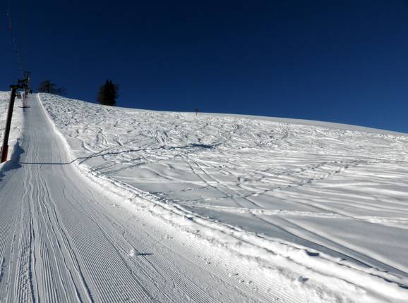Un breve tratto ripido sulla discesa a valle e, di tanto in tanto, la possibilità di sciare nella neve fresca entusiasmano gli esperti. Tuttavia, l'offerta è limitata.