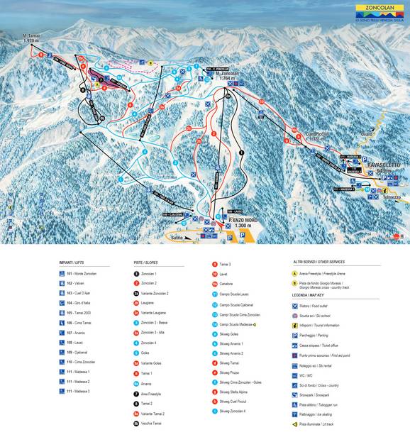 La mappa delle piste rappresenta molto bene l’area sciistica. Le piste, gli impianti di risalita e i punti importanti dell’area sono segnati molto chiaramente. Le informazioni dettagliate potrebbero essere integrate.